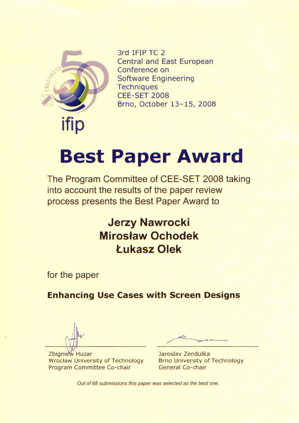 10. Łukasz Olek, Jerzy Nawrocki, and Mirosław Ochodek: Enhancing Use Cases with Screen Designs In: Software Engineering Techniques: Third IFIP TC 2 Central and East European Conference, CEE-SET 2008, Brno, Czech Republic, October 2008, Revised Selected Papers, ed. by Huzar Z., Koci R., Meyer B., Walter B., Zendulka J., vol. 4980, pp. 48-61, Springer Verlag. Lecture Notest in Computer Science. 2011.