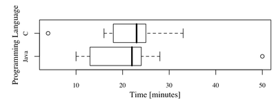 Imagine you have conducted a simple experiment in which you wanted to compare efficiency of programmers using Java and C languages. You executed the experiment, giving the same tasks to both groups of developers. Lets assume that each group consisted of 21 people. Now you would like to visualize your data...