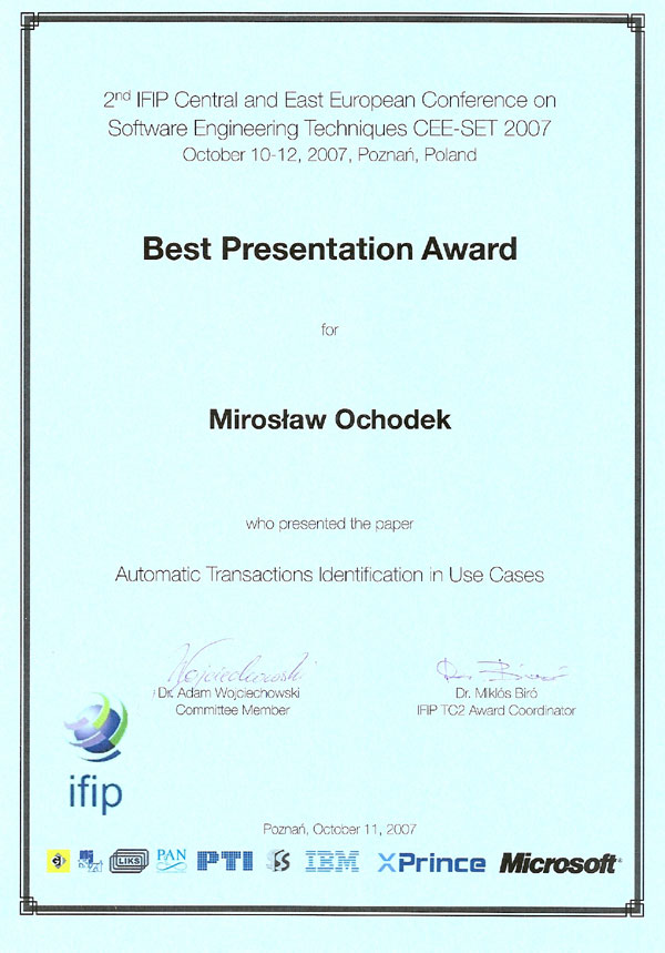 Automatic Transactions Identification in Use CasesMirosław Ochodek and Jerzy Nawrocki (2008) In: Balancing Agility and Formalism in Software Engineering: 2nd IFIP Central and East European Conference on Software Engineering Techniques CEE-SET 2007, vol. 5082, pp. 55-68, Springer Verlag. LNCS. |